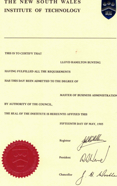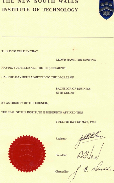 University of Technology Sydney (NSWIT) Lloyd was the first student enrolled in the NSWIT/UTS first UTS (NSWIT) MBA course:
