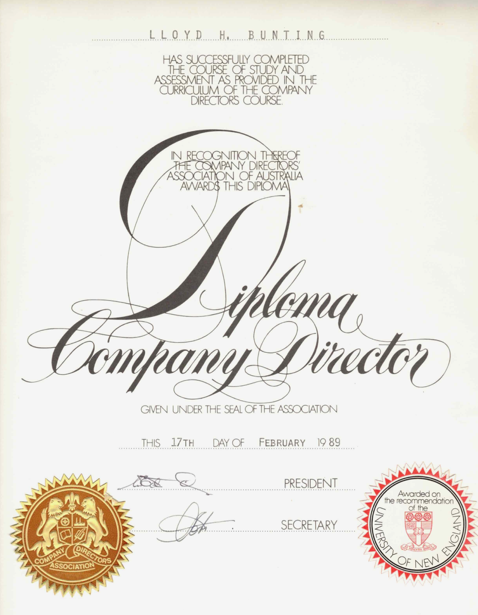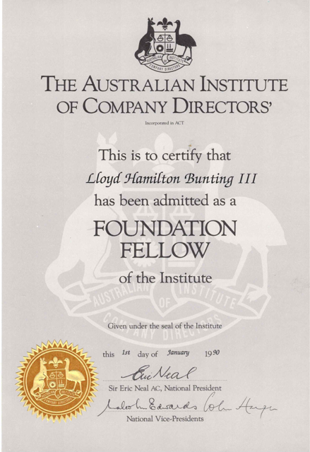 - Company Director Diploma, University of New England This was the first company director's course and Lloyd became a Fellow of the Company Director's Association. When CDA merged with the Australian Institute of Company Directors Lloyd became a Foundation Fellow of the AICD.